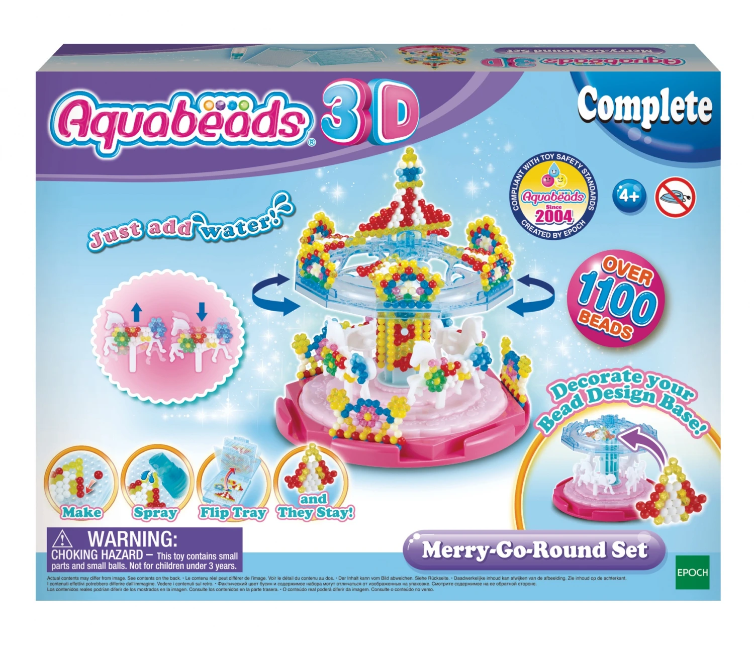 De draaimolenset wordt compleet geleverd met meer dan 1.100 parels en een schattige draaimolenbasis. Met deze set uit de gloednieuwe Aquabeads 3D-serie kun je gemakkelijkere, grotere en overzichtelijke 3D-ontwerpen maken! Je kunt de draaimolen ronddraaien door zachtjes in het dak te knijpen en eraan te draaien, de paarden gaan zelfs op en neer wanneer ze ronddraaien! Er worden 3 sets aan bonuspatronen meegeleverd zodat je meer ontwerpen kunt maken met de apart verkochte navullingen. Geschikt voor kinderen van vier jaar en ouder.
