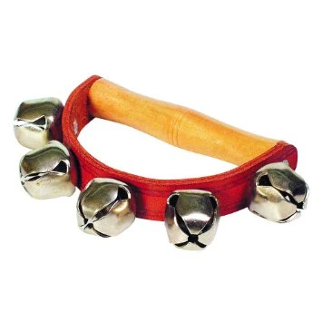 Leuk muziekinstrumen5tje, ook voor de allerkleinsten. De handgreep is 10 cm. breed. De 5 bellen zijn vastgezet op een leren band.