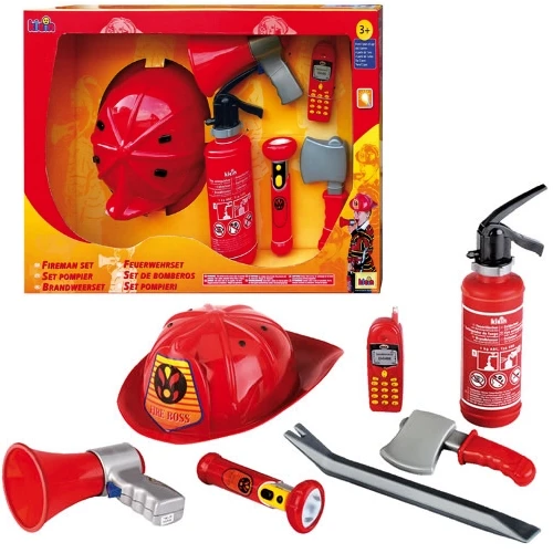 Deze 7 delige set bestaande uit brandweerhelm, poederblusser, megafoon, breekijzer, bijl, zaklamp en GSM.