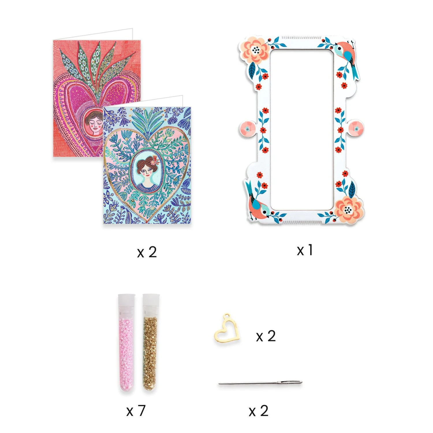 In een mooie glanzende doos, alle materialen inbegrepen om 2 armbandjes te maken met een weefraam. Door de stappenen patronen in het boekje te volgen weef je de kleine gekleurde kralen op het weefgetouw. Leuk voor jezelf of om cadeau te geven. Er zijn 2 organza zakjes bijgesloten waarin je de armbandjes kunt bewaren of daarin verpakt cadeau kunt geven. Daarbij zijn er 2 lieflijk geïllustreerde kaarten waarop je persoonlijke berichtjes voor de ontvangers kunt schrijven.