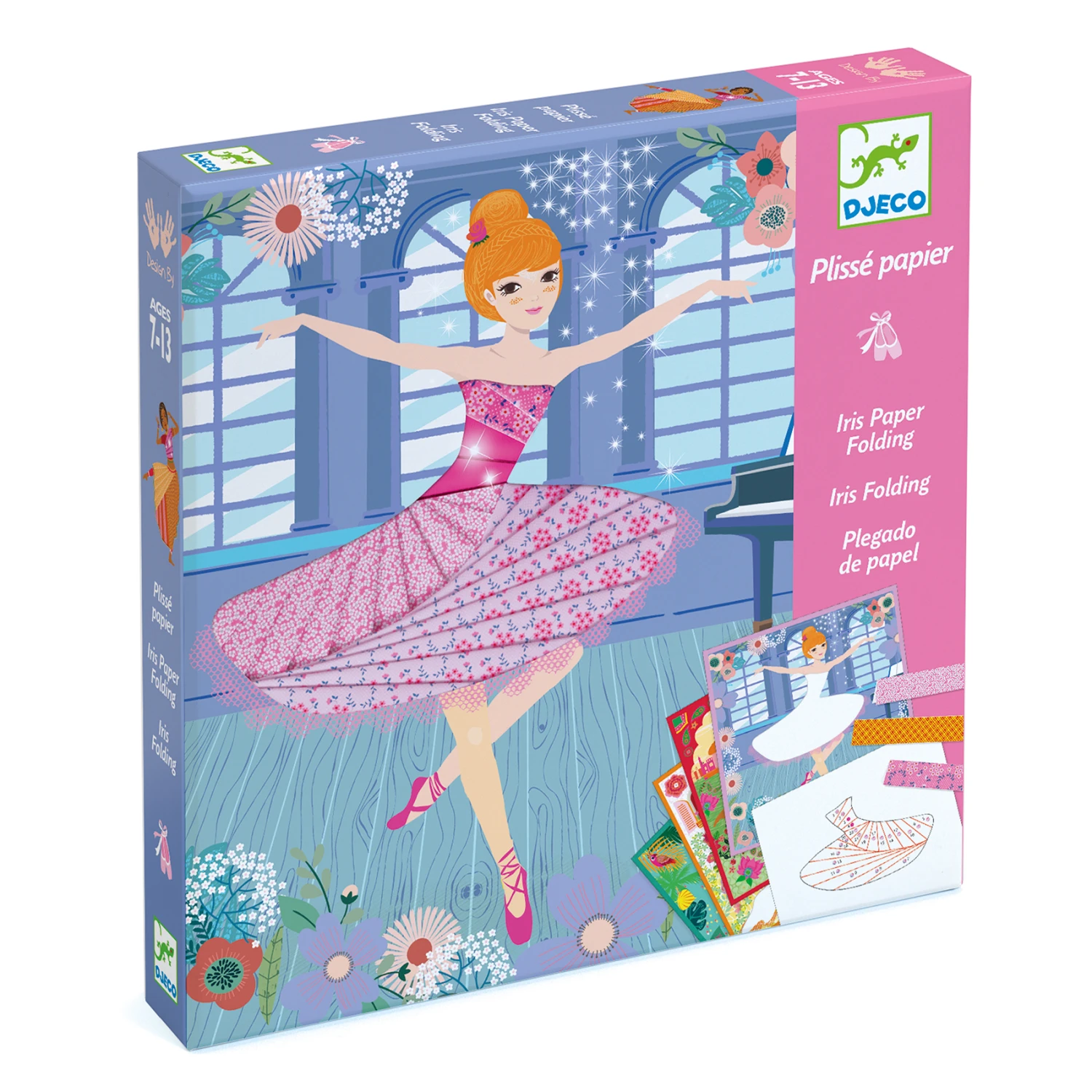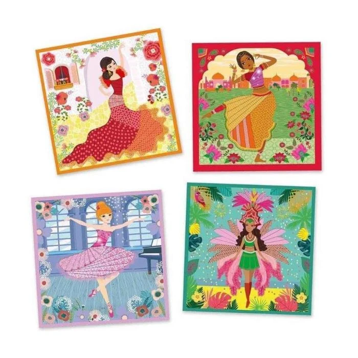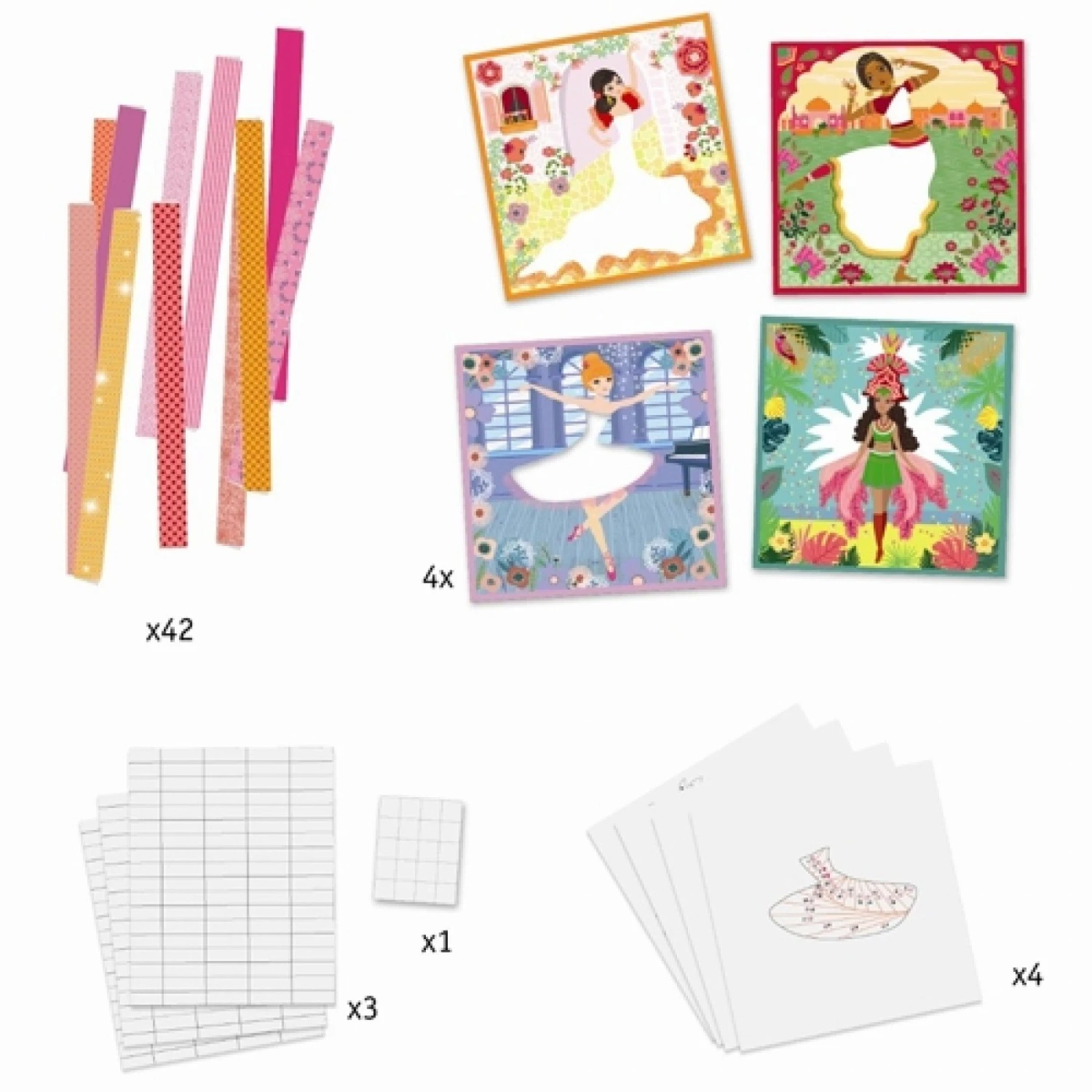 Maak 4 schilderijtjes met danseressen in hun mooiste en zwierigste outfits. Vouw de kleurrijke stroken papier en breng ze aan in een patroon. Hierdoor ontstaat diepte en een schaduw en lichtspel met prachtig resultaat.
