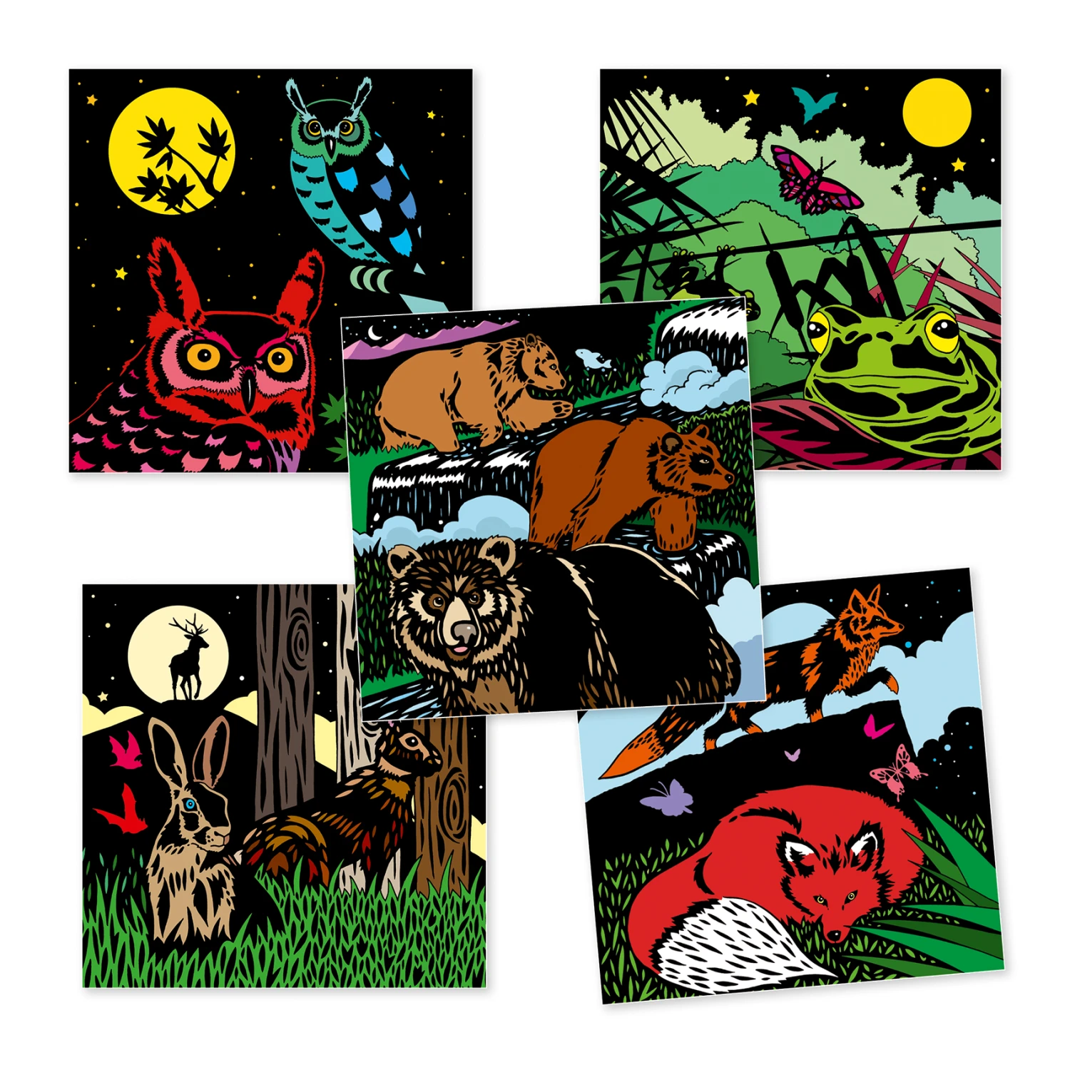 Maak prachtig schilderijtjes met deze bijzondere kleurplaten in het thema “het bosleven” van Djeco. Kleuren zonder buiten de lijntjes te gaan.