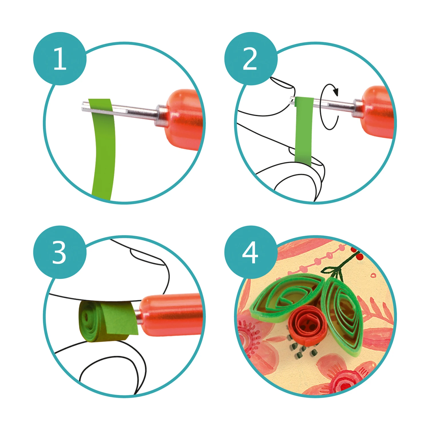 Door strookjes papier op te rollen m.b.v. het sjabloon en het speciale quillingpennetje kunnen permanentjes, pruiken en andere krullen gemaakt worden.