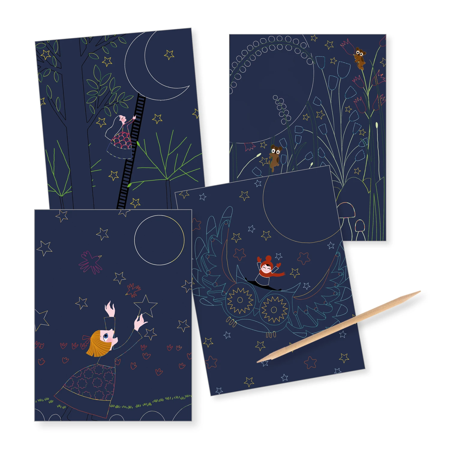 4 kraskaarten met stokje met afgeronde punt, geschikt voor kleine kinderen in het thema Nachtleven.