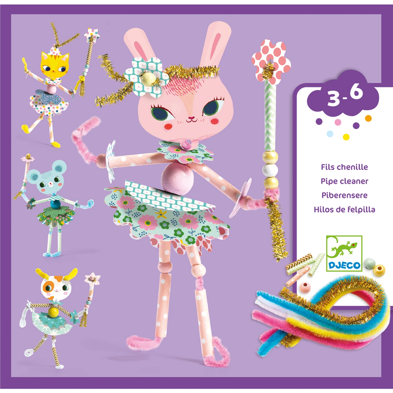 Knutsel mooie magische feeën met deze knutseldoos Rijgen van Djeco (DJ08976). Knip de vouwfiguurtjes uit, plak en vouw ze en rijg ze vervolgens samen met de buisjes en houten kralen aan de verschillend gekleurde chenille-ijzerdraadjes om vrolijke dierenfeetjes te maken. De feetjes worden ongeveer 20 cm in lengte, en zijn te versieren zoals jij dat wil! Deze doos is een oefening bij uitstek voor de fijne motoriek, en geschikt voor kinderen tussen de 3 en 6 jaar.