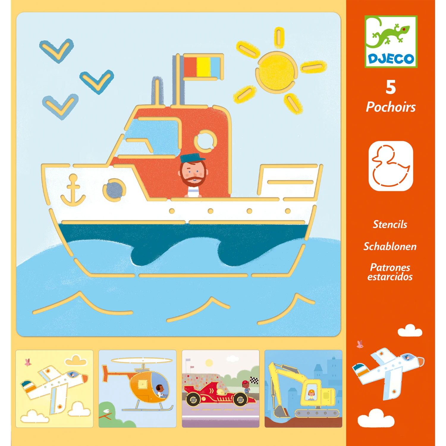 Met deze 5 sjablonen van transportmiddelen kunnen kinderen eindeloos veel mooie tekeningen maken. Leg het sjabloon op papier, volg de lijntjes met een potlood of stift en kleur de tekening in.