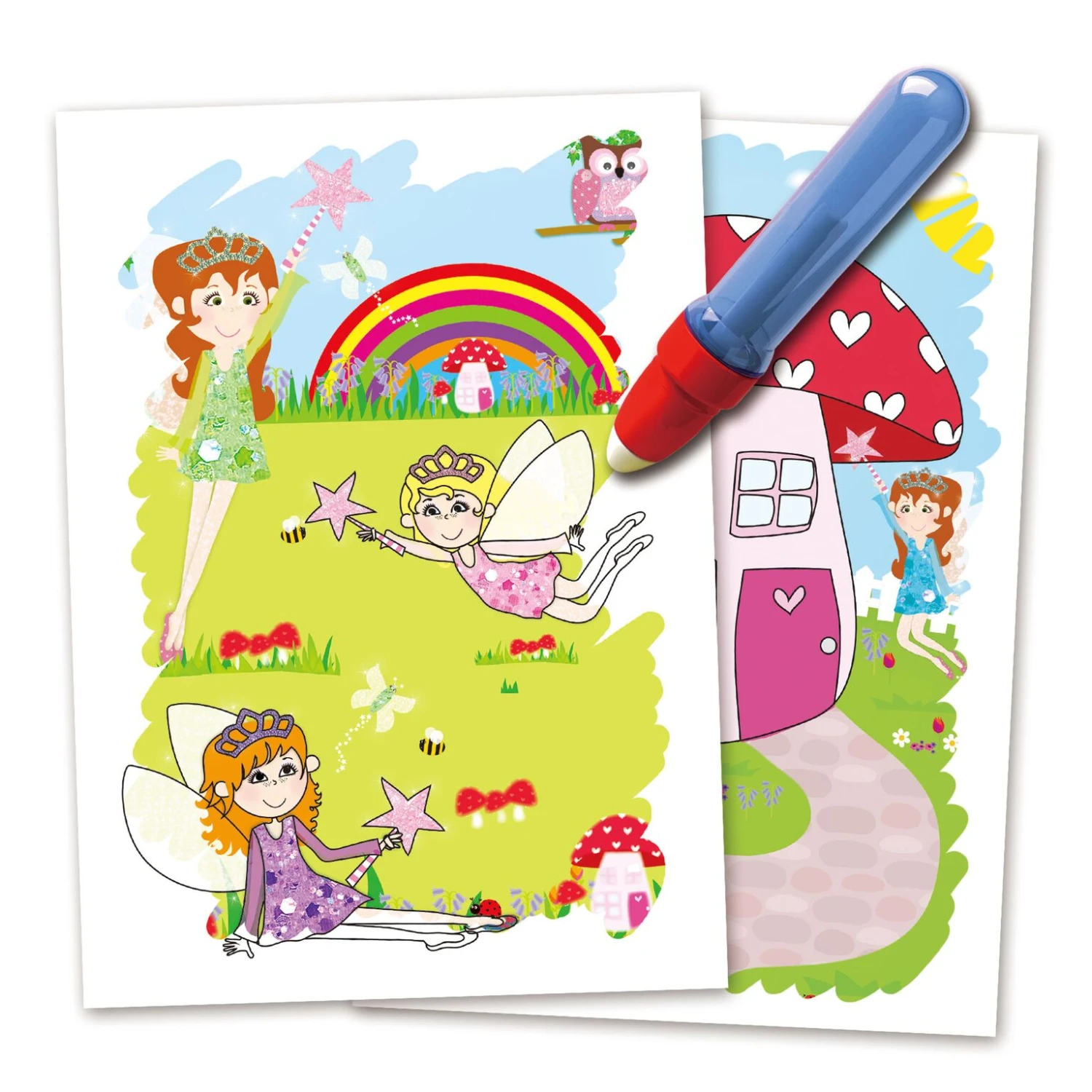 Vul de meegeleverde stift met water en zie hoe de feeen te voorschijn komen door te kleuren met water. Het lijkt wel magie, zodra de plaatjes opgedroogd zijn is de tekening weer weg. Zo kun je keer op keer genieten van het magische kleuren met water! In totaal 6 verschillende kleurplaten!