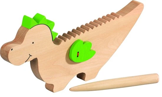 Maak een ratelend geluid door het stokje over de stekels op de rug van de draak te bewegen.