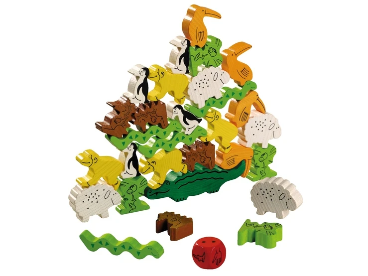 De dieren willen hun kunstje vertonen – de grote piramide! Nu moet er voorzichtig en behendig te werk worden gegaan: wie kan de pinguïn op de krokodil zetten, het schaap op de pinguïn en de slang op het schaap.