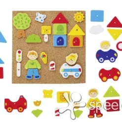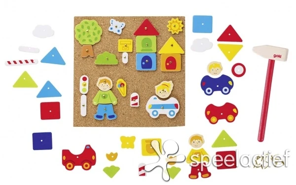 Hamerspel met 50 houten vormpjes, 40 spijkers, eenn kurkplaat en een houten hamer.