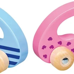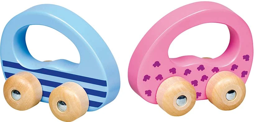 Houten auto, in blauw en rose. Bij uitstek geschikt voor kleine handjes.