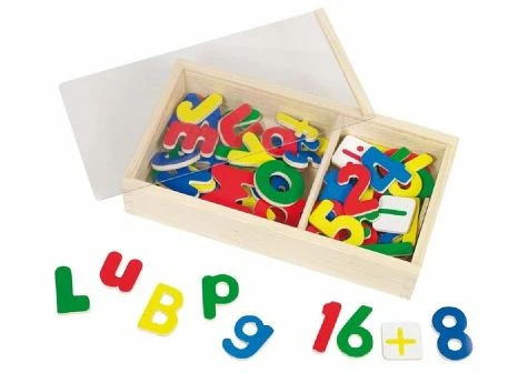 89-delige set met magnetische houten letters en cijfers. De letters en getallen meten ongeveer 5,5 cm.