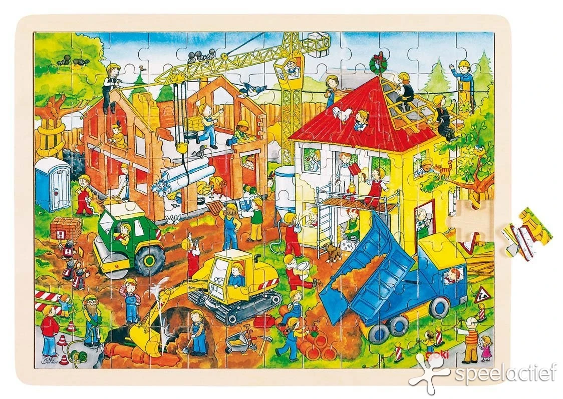 Houten legpuzzel met thema de bouwplaats. De afbeelding bestaat uit 96 stukjes. Afmetingen puzel: 40 x 30 cm.