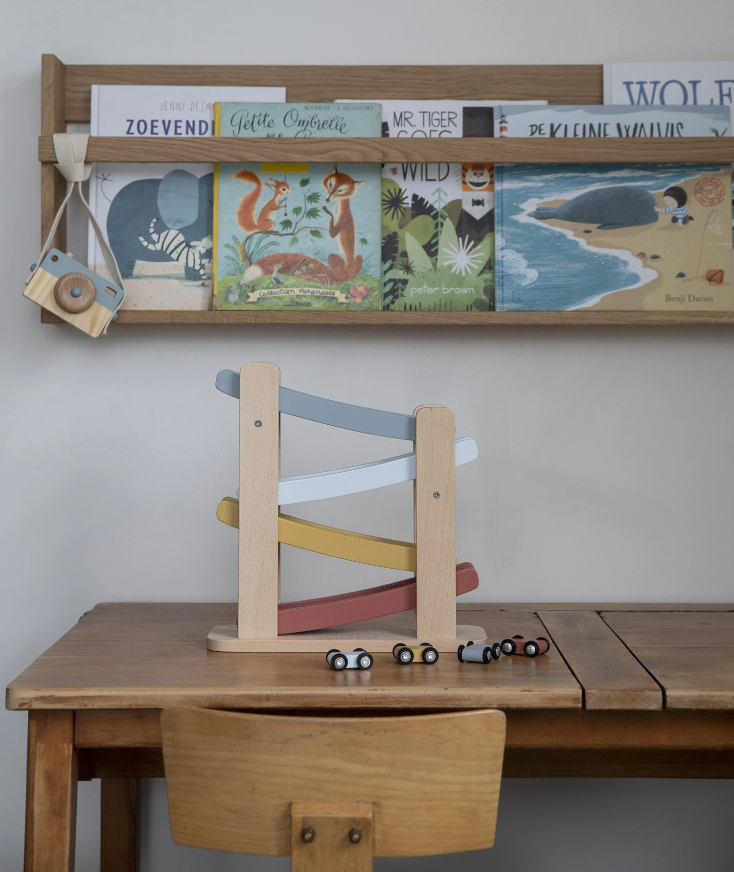 1, 2, 3, racen maar! Met deze vrolijke houten autobaan inclusief 4 auto’s vermaakt je kleintje zich prima. Plaats de auto’s één voor één boven op de racebaan, laat ze los en ze racen naar beneden.