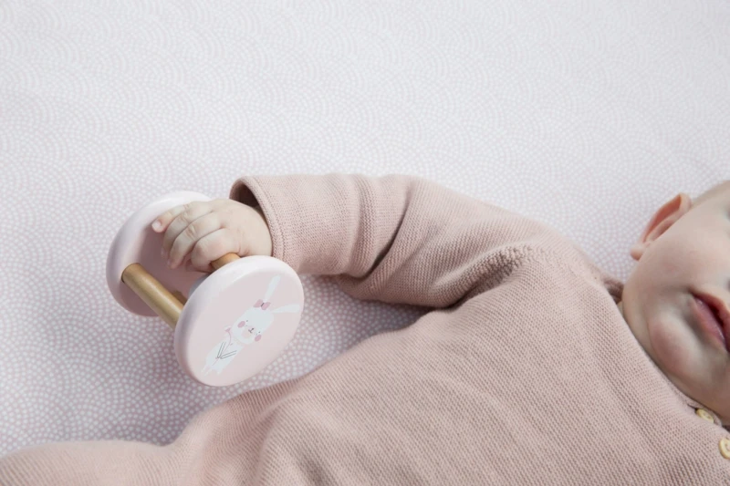 Deze rammelaar kan rollen en het belletje geeft een rinkelende geluidje. Kleintjes vinden het prachtig en kunnen de rammelaar goed vasthouden aan de houten spijlen. De rammelaar is van stevig hout gemaakt en kan tegen een stootje.Â