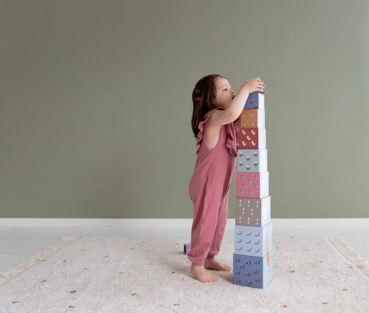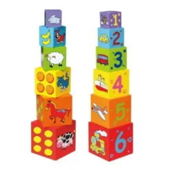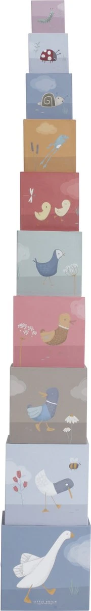 Kinderen leren spelenderwijs tot 10 te tellen met deze blokkentoren. De blokken zijn geïllustreerd met onze herkenbare Gans en al zijn vriendjes die rond de vijver op het platteland wonen.Je kunt de blokken op elkaar zetten en een hoge toren maken of horizontaal op de grond leggen om de verschillende groottes te ontdekken. Vanaf 18 maanden.
