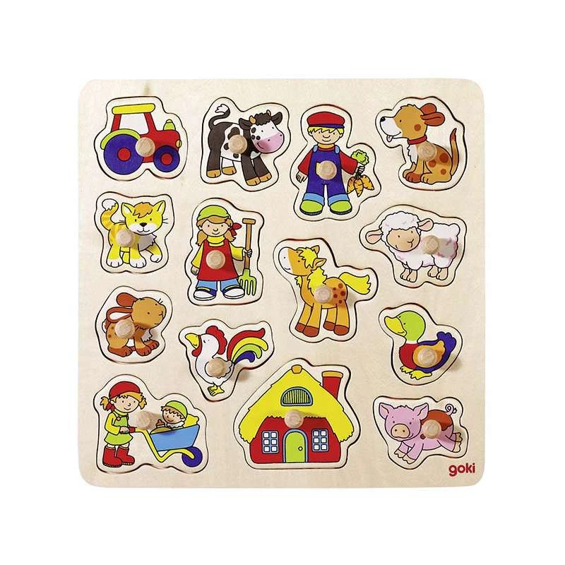 Houten noppenpuzzel met 14 puzzelstukken.