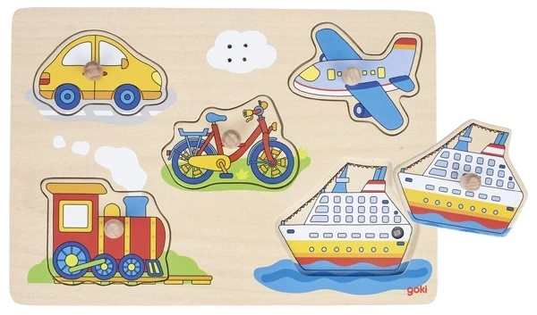 Houten puzzel met 8 voertuigen en de bijpassende geluiden. Wanneer het juiste puzzelstukje ingelegd wordt, klinkt het bijpassende geluid.