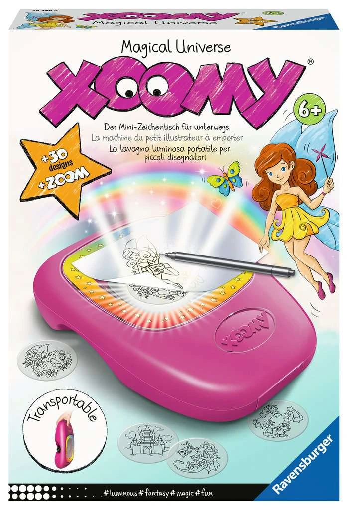 Met de compacte Xoomy® tekenkoffer van Ravensburger maken kleine tekenaars met gemak de mooiste tekeningen. Hoe? Met behulp van de zoom kunnen alle afbeeldingen worden vergroot en verkleint worden. Verschillende thema’s kunnen gemakkelijk met elkaar worden gecombineerd. Met deze Xoomy® Medium Fairies & Unicorns kun je de vrolijkste tekeningen maken. Als je klaar bent kan je alles weer veilig opbergen en overal mee naar toe nemen.