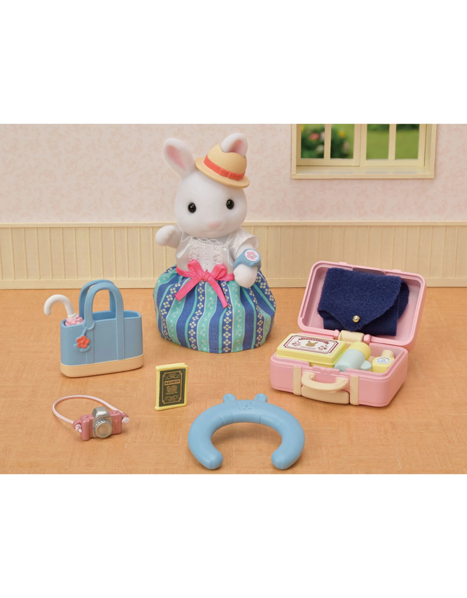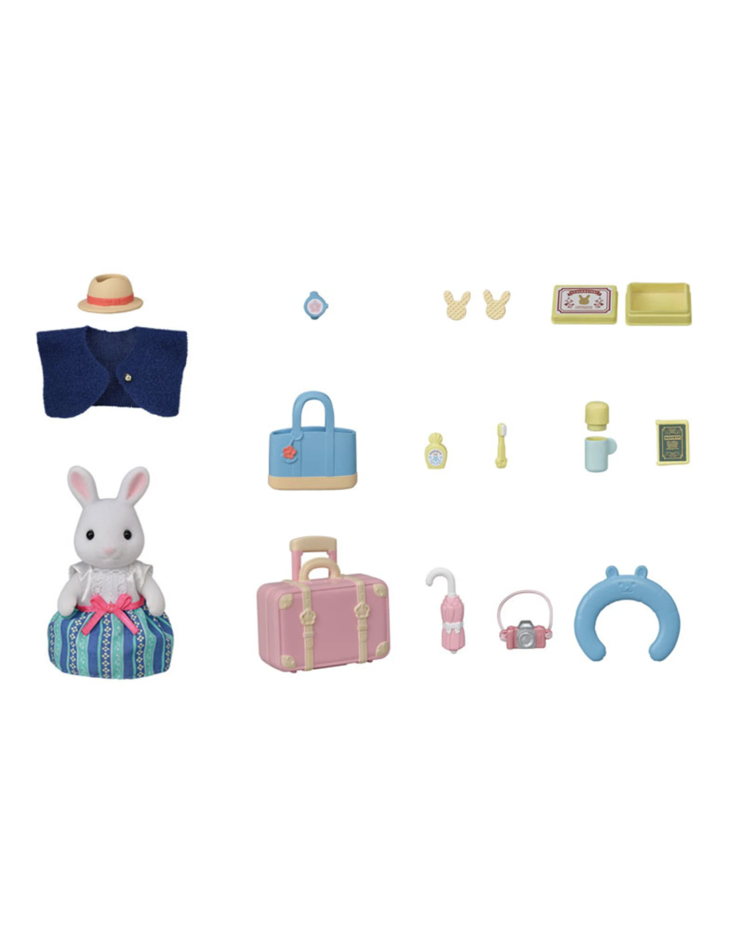 De set bestaat uit een koffer met inhoud, een paraplu, nekkussen, hoed, fototoestel en nog meer belangrijke accessoires tijdens de reis.